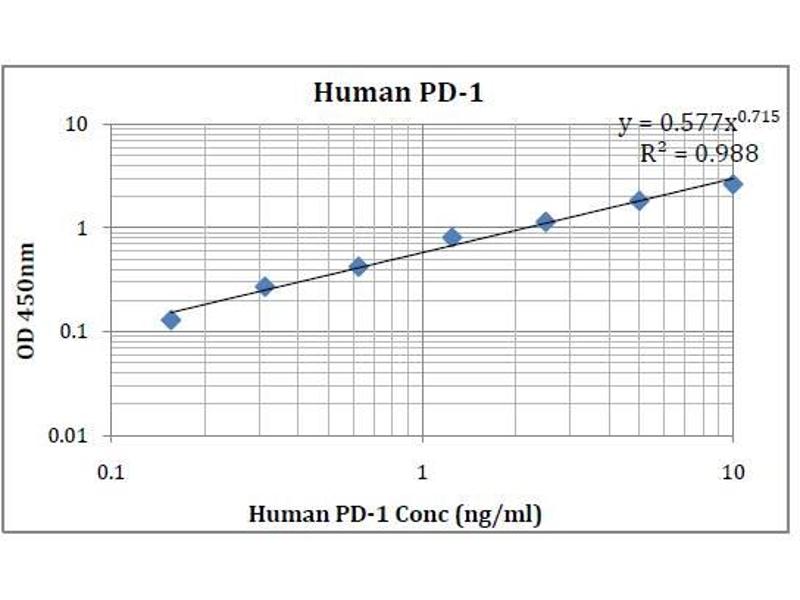 - This kit was based on sandwich enzyme-linked immune-sorbent assay technology. Anti- Human PD-1 antibody was pre-coated into 96-well plates. Biotin conjugated anti-human PD-1 detection antibody was used. Standards, test samples and biotin conjugated detection antibody were added to the wells subsequently. Wash buffer was used to wash any non-specific binding. HRP conjugated Streptavidin was used as secondary antibody. TMB substrates were used to visualize HRP enzymatic reaction. TMB was catalyzed by HRP to produce a blue color product that changed into yellow after adding acidic stop solution. The density of yellow is proportional to the Human PD-1 amount of samples captured in the plate. Optical Density (O.D) can be read at absorbance 450nm in a microplate reader. Concentration of Human PD-1 can be calculated using the standard curve.