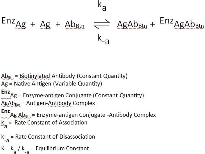 - Competitive Enzyme Immunoassay (TYPE 7): The essential reagents required for a enzyme immunoassay include antibody, enzyme-antigen conjugate and native antigen. Upon mixing biotinylated antibody, enzyme-antigen conjugate and a serum containing the native antigen, a competition reaction results between the native antigen and the enzyme-antigen conjugate for a limited number of antibody binding sites.