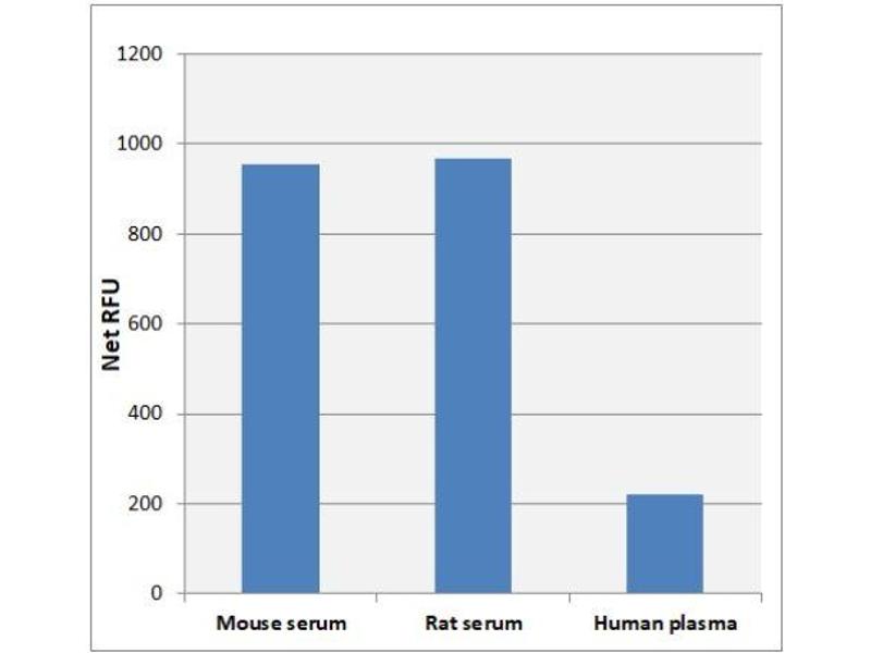 Samples should be assayed immediately or stored at -80 °C prior to performing the assay. Optimal experimental conditions for samples must be determined by the investigator. The following recommendations are only guidelines and may be altered to optimize or complement the user's experimental design. A set of serial dilutions is recommended for samples to achieve optimal assay results and minimize possible interfering compounds. Run proper controls as necessary. Always run a standard curve with samples. Tissue lysates: Sonicate or homogenize tissue sample in cold PBS and centrifuge at 10,000 x g for 10 minutes at 4 °C. Aliquot the supernatant for storage at -80 °C. Perform dilutions in deionized H2O. Cell lysates: Wash cells 3 times with cold PBS prior to lysis. Lyse cells with sonication or homogenation in cold PBS and centrifuge at 10,000 x g for 10 minutes at 4 °C. Aliquot the supernatant for storage at -80 °C. Perform dilutions in deionized H2O. Serum: Avoid hemolyzed and lipemic blood samples. Collect blood in a tube with no anticoagulant. Allow the blood to clot at room temperature for 30 minutes. Centrifuge at 2500 x g for 20 minutes. Remove the yellow serum supernatant without disturbing the white buffy layer. Aliquot samples for testing and store at -80 °C. Dilute samples at least 1:4 in deionized H2O and perform further dilutions as necessary. Plasma: Avoid hemolyzed and lipemic blood samples. Collect blood with heparin or citrate and centrifuge at 2000 x g and 4 °C for 10 minutes. Remove the plasma layer and store on ice. Avoid disturbing the white buffy layer. Aliquot samples for testing and store at -80 °C. Dilute samples at least 1:4 in deionized H2O and perform further dilutions as necessary.