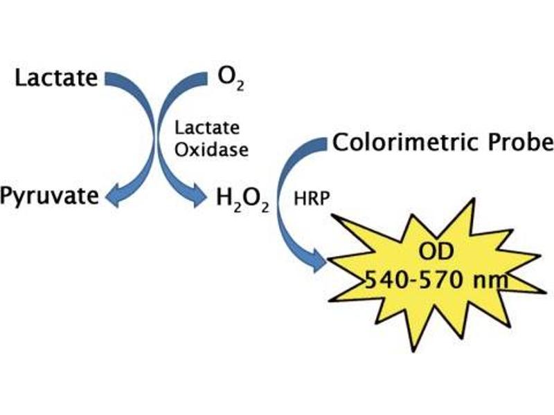 - Lactate is oxidized by lactate oxidase into pyruvate and hydrogen peroxide. The hydrogen peroxide is then detected with a highly specific colorimetric probe. Horseradish peroxidase catalyzes the reaction between the probe and hydrogen peroxide, which bind in a 1:1 ratio. Samples and standards are incubated for 30-45 minutes and then read with a standard 96-well colorimetric plate reader . Samples are compared to a known concentration of lactate standard within the 96-well microtiter plate format. . Lactate assay principle.