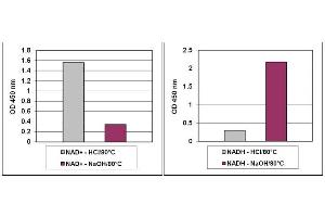 - To measure NAD and destroy NADH, add 25 μL of sample to a microcentrifuge tube. Add 5 μL of 0.1 N HCl and mix thoroughly. Incubate the tube at 80 °C for 60 minutes and protected from light. Centrifuge the tube to pool all sample solution. Add 20 μL of 1X Assay Buffer to shift the pH of the sample back to neutral. Vortex to mix and centrifuge to pool sample. Keep sample on ice until assaying. Notes: + +If testing both total NAD /NADH and individual cofactors, dilute the total NAD /NADH samples 1:2 with Assay buffer to maintain sample dilution consistency. Avoid samples containing SH groups like DTT, β-mercaptoethanol, or reduced gluathione. Samples should be close to neutral pH before harvesting. Samples with extremely high or low pH values could fail to yield reliable results.