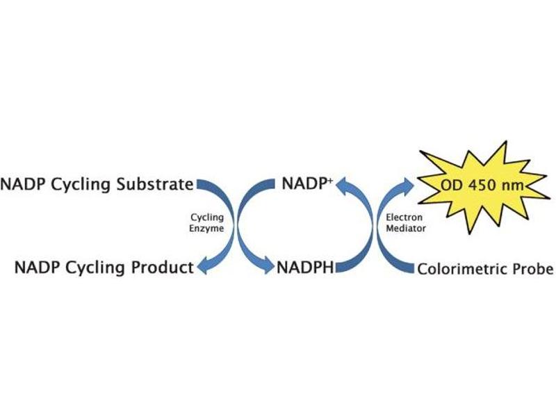 - NADP+ /NADPH Assay Kit is a convenient quantitative tool that measures NADP+ and NADPH within biological samples. The assay is based on an enzymatic cycling reaction in which NADP+ is reduced to NADPH. NADPH reacts with a colorimetric probe that produces a colored product which can be measured at 450 nm. The intensity of the product color is proportional to the NADP+ and NADPH within a sample. A simple acid or base treatment will differentiate NADPH from NADP+ within a sample. Samples and standards are incubated for 1-4 hours and then read with a standard 96-well colorimetric plate reader . Samples are compared to a known concentration of NADP+ standard within the 96-well microtiter plate format. . NADP+/NADPH Cycling Assay Principle. 2