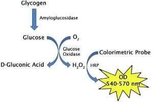 Glycogen is broken down into glucose monomers by amyloglucosidase first, glucose is then oxidized by glucose oxidase into D-gluconic acid and hydrogen peroxide. The resulting hydrogen peroxide is then detected with a highly specific colorimetric probe. Horseradish peroxidase catalyzes the reaction between the probe and hydrogen peroxide, which bind in a 1:1 ratio. Samples are compared to a known concentration of glycogen standard within the 96-well microtiter plate format. Samples and standards are incubated for 45 minutes and then read with a standard 96-well colorimetric plate reader .