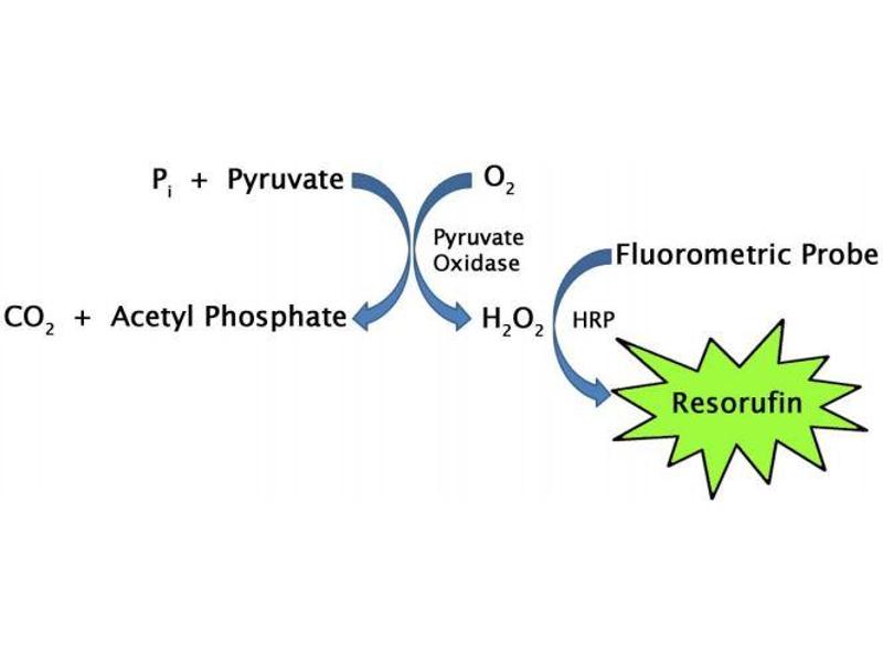 - Pyruvate is oxidized by pyruvate oxidase in the presence of phosphate and oxygen into acetyl phosphate, carbon dioxide, and hydrogen peroxide. The resulting hydrogen peroxide is then detected with a highly specific fluorometric probe. Horseradish peroxidase catalyzes the reaction between the probe and hydrogen peroxide, which bind in a 1:1 ratio. Samples are compared to a known concentration of pyruvate standard within the 96-well microtiter plate format. Samples and standards are incubated for 30 minutes and then read with a standard 96-well fluorometric plate reader .