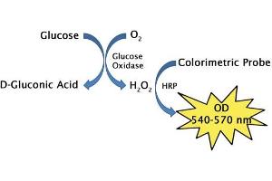 - Total Glucose Assay Kit measures total glucose within food or biological samples. Glucose is oxidized by glucose oxidase into D-gluconic acid plus hydrogen peroxide. The hydrogen peroxide is then detected with a highly specific colorimetric probe. Horseradish peroxidase catalyzes the reaction between the probe and hydrogen peroxide, which bind in a 1:1 ratio. Samples are compared to a known concentration of glucose standard within the 96-well microtiter plate format. Samples and standards are incubated for 30-45 minutes and then read with a standard 96-well colorimetric plate reader . . Glucose assay principle.
