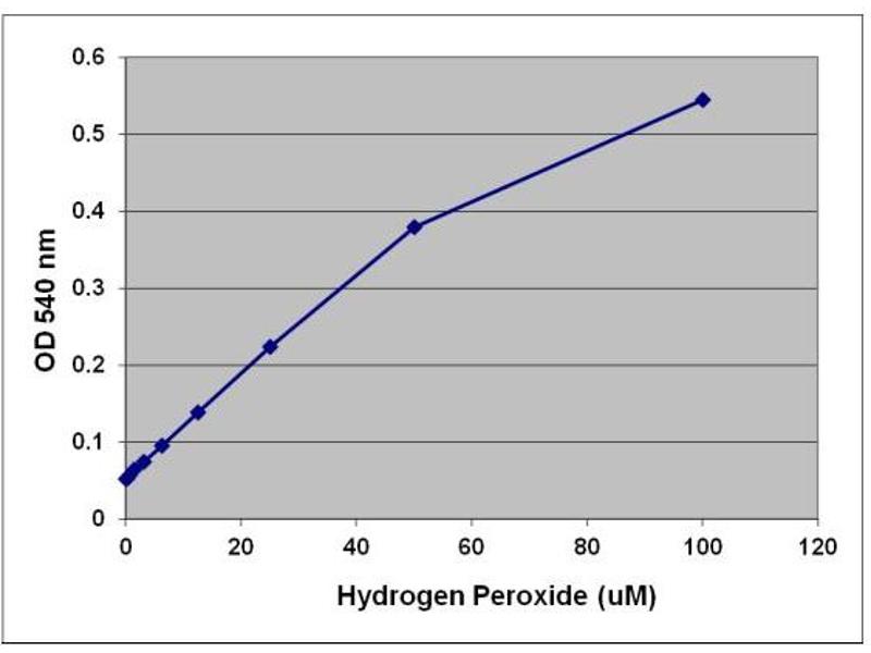 - A serial dilution will be necessary depending on the total H2O2 or peroxidase present. Extremely high levels of H2O2 (≥ 500 μM final concentration) or peroxidase (≥ 100 mU/mL) can lower the absorbance because excess H2O2 or peroxidase can further oxidize the reaction product.