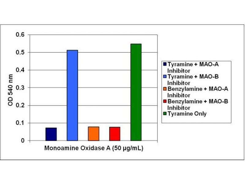 - OxiSelect™ Monoamine Oxidase Assay Kit is a simple HTS-compatible assay for measuring amine oxidase activity. The assay can detect both MAO activity and semicarbizide- sensitive amine oxidases (SSAO). In order to discriminate between MAO-A and MAO-B, the MAO-A inhibitor Clorgyline and MAO-B inhibitor Pargyline are included. In addition, two substrates, Tyramine, and Benzylamine Hydrochloride, are included. Tyramine will react with MAO-A, MAO-B, and SSAO, while Benzylamine will react with MAO-B and SSAO. The two amine oxidase substrates are interchangeable in the assay, and coupled with the provided MAO inhibitors, can be used to determine MAO activity. Applications for the kit include measuring amine oxidase in tissues, blood samples, and screening for amine oxidase inhibitors or substrates. The kit has a detection sensitivity limit of 0.05 U/L. Each kit provides sufficient reagents to perform up to 96 assays, including standard curve and unknown samples.