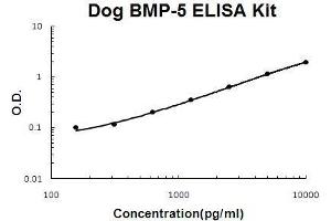 Background: Bone morphogenetic protein 5 is a protein that in Dog Canineas is encoded by the BMP5 gene.1,2,3 The protein encoded by this gene is member of the TGFbeta superfamily. Bone morphogenetic proteins are known for their ability to induce bone and cartilage development. BMP5 may play a role in certain cancers. Like other BMP's BMP5 is inhibited by chordin and noggin. It is expressed in the trabecular meshwork and optic nerve head and may have a role in the development and normal function. It is also expressed in the lung and liver. BMP-5 is mapped on Dog Caninea chromosome 6.4 The standard used in this kit is recombinant BMP-5 with the monomer molecular mass of 18KDa.