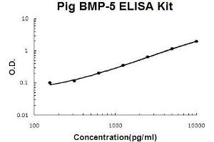 Background: Bone morphogenetic protein 5 is a protein that in humans is encoded by the BMP5 gene.1,2,3 The protein encoded by this gene is member of the TGFbeta superfamily. Bone morphogenetic proteins are known for their ability to induce bone and cartilage development. BMP5 may play a role in certain cancers. Like other BMP's BMP5 is inhibited by chordin and noggin. It is expressed in the trabecular meshwork and optic nerve head and may have a role in the development and normal function. It is also expressed in the lung and liver. BMP-5 is mapped on Pig porcine chromosome 6.4 The standard used in this kit is recombinant BMP-5 with the monomer molecular mass of 18KDa.