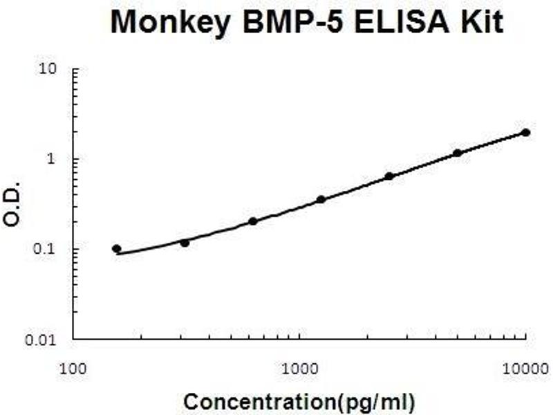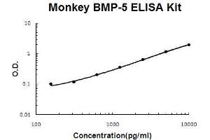 Background: Bone morphogenetic protein 5 is a protein that in humans is encoded by the BMP5 gene.1,2,3 The protein encoded by this gene is member of the TGFbeta superfamily. Bone morphogenetic proteins are known for their ability to induce bone and cartilage development. BMP5 may play a role in certain cancers. Like other BMP's BMP5 is inhibited by chordin and noggin. It is expressed in the trabecular meshwork and optic nerve head and may have a role in the development and normal function. It is also expressed in the lung and liver. BMP-5 is mapped on monkey primate chromosome 6.4 The standard used in this kit is recombinant BMP-5 with the monomer molecular mass of 18KDa.