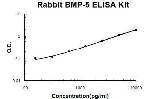 Background: Bone morphogenetic protein 5 is a protein that in humans is encoded by the BMP5 gene.1,2,3 The protein encoded by this gene is member of the TGFbeta superfamily. Bone morphogenetic proteins are known for their ability to induce bone and cartilage development. BMP5 may play a role in certain cancers. Like other BMP's BMP5 is inhibited by chordin and noggin. It is expressed in the trabecular meshwork and optic nerve head and may have a role in the development and normal function. It is also expressed in the lung and liver. BMP-5 is mapped on rabbit chromosome 6.4 The standard used in this kit is recombinant BMP-5 with the monomer molecular mass of 18KDa.