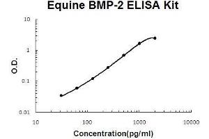 Background: Bone morphogenetic protein-2(BMP-2, BMP 2A) belongs to the transforming growth factor beta(TGF-beta) superfamily. It is thought to be involved in cartilage and bone formation during embryogenesis, but may have additional functions in morphogenesis as implied by its expression in various organs and embryonic tissues of mice.1 BMP-2 has been identified as a candidate mediator of retinoid activity. BMP-2 protein induces medulloblastoma cell apoptosis, whereas the BMP-2 antagonist noggin blocks both retinoid and BMP-2-induced apoptosis. BMP-2 also induces p38 mitogen-activated protein kinase(MAPK), which is necessary for BMP-2 and retinoid-induced apoptosis.2 Bone morphogenic proteins(BMPs) are known to promote osteogenesis, and clinical trials are currently underway to evaluate the ability of certain BMPs to promote fracture-healing and spinal fusion.3 The standard product used in this kit is recombinant horse equine BMP-2, constituting dimer by two chains of 114 amino acids with the molecular mass of 26KDa.