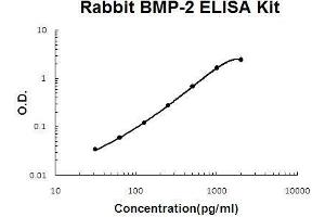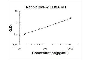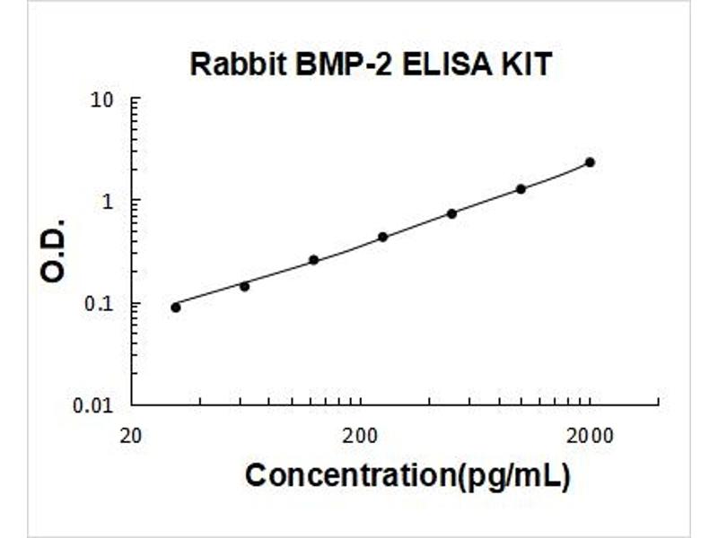 Background: Bone morphogenetic protein-2(BMP-2, BMP 2A) belongs to the transforming growth factor beta(TGF-beta) superfamily. It is thought to be involved in cartilage and bone formation during embryogenesis, but may have additional functions in morphogenesis as implied by its expression in various organs and embryonic tissues of mice.1 BMP-2 has been identified as a candidate mediator of retinoid activity. BMP-2 protein induces medulloblastoma cell apoptosis, whereas the BMP-2 antagonist noggin blocks both retinoid and BMP-2-induced apoptosis. BMP-2 also induces p38 mitogen-activated protein kinase(MAPK), which is necessary for BMP-2 and retinoid-induced apoptosis.2 Bone morphogenic proteins(BMPs) are known to promote osteogenesis, and clinical trials are currently underway to evaluate the ability of certain BMPs to promote fracture-healing and spinal fusion.3 The standard product used in this kit is recombinant rabbit BMP-2, constituting dimer by two chains of 114 amino acids with the molecular mass of 26KDa.