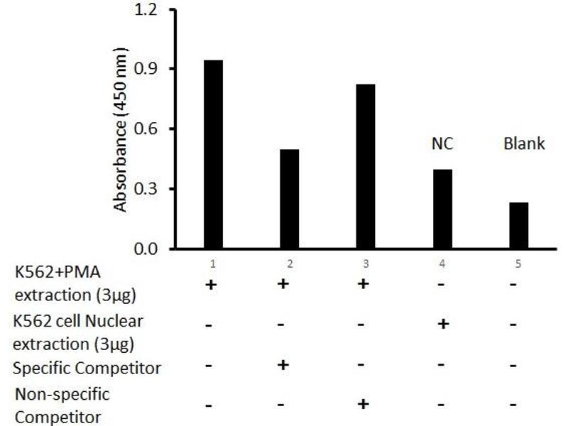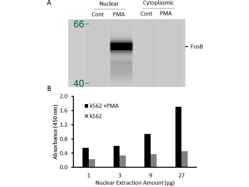 The olionucleotide/antibody pair provided in this kit recognizes human fosB in whole lysates and nuclear extracts.