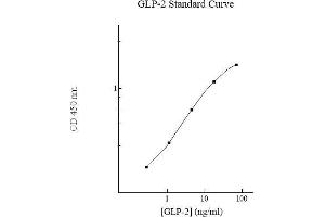 Prepare all reagents, standard solutions, and samples as instructed. Bring all reagents to room temperature before use. The assay is performed at room temperature (20-25 °C). Remove excess microplate strips from the plate frame and return them immediately to the foil pouch with desiccants inside. Reseal the pouch securely to minimize exposure to water vapor and store in a vacuum desiccator. Add 50 l of GLP-2 Standard or sample per well. Cover wells with a sealing tape and incubate for 2 hours. Start the timer after the last addition. Wash five times with 200 l of Wash Buffer manually. Invert the plate each time and decant the contents, hit 4-5 times on absorbent material to completely remove the liquid. If using a machine, wash six times with 300 l of Wash Buffer and then invert the plate, decanting the contents, hit 4-5 times on absorbent material to completely remove the liquid. Add 50 l of Biotinylated GLP-2 Antibody to each well and incubate for 1 hour. Wash the microplate as described above. Add 50 l of Streptavidin-Peroxidase Conjugate per well and incubate for 30 minutes. Turn on the microplate reader and set up the program in advance. Wash the microplate as described above. 5 Add 50 l of Chromogen Substrate per well and incubate for 15 minutes or till the optimal color density develops. Gently tap the plate to ensure thorough mixing and break the bubbles in the well with pipette tip. Add 50 l of Stop Solution to each well. The color will change from blue to yellow. Read the absorbance on a microplate reader at a wavelength of 450 nm immediately. If wavelength correction is available, subtract readings at 570 nm from those at 450 nm to correct optical imperfections. Otherwise, read the plate at 450 nm only. Please note that some unstable black particles may be generated at high concentration points after stopping the reaction for about 10 minutes, which will reduce the readings.