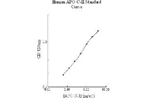 Prepare all reagents, standard solutions, and samples as instructed. Bring all reagents to room temperature before use. The assay is performed at room temperature (20-25 °C). Remove excess microplate strips from the plate frame and return them immediately to the foil pouch with desiccants inside. Reseal the pouch securely to minimize exposure to water vapor and store in a vacuum desiccator. Add 50 l of Human Apolipoprotein C-II Standard or sample to each well. Gently tap plate to thoroughly coat the wells. Break any bubbles that may have formed. Cover wells with a sealing tape and incubate for 2 hours. Start the timer after the last addition. Wash five times with 200 l of Wash Buffer manually. Invert the plate each time and decant the contents, hit 4-5 times on absorbent material to completely remove liquid. If using a machine, wash six times with 300 μL of Wash Buffer and then invert the plate, decanting the contents, hit 4-5 times on absorbent material to completely remove the liquid. Add 50 l of Biotinylated Human Apolipoprotein C-II Antibody to each well. Gently tap plate to thoroughly coat the wells. Break any bubbles that may have formed. Cover wells with a sealing tape and incubate for 1 hour. Wash the microplate as described above. Add 50 l of SP Conjugate to each well. Gently tap plate to thoroughly coat the wells. Break any bubbles that may have formed. Cover wells with a sealing tape and incubate for 30 minutes. Turn on the microplate reader and set up the program in advance. Wash the microplate as described above. Add 50 l of Chromogen Substrate to each well. Gently tap plate to thoroughly coat the wells. Break any bubbles that may have formed. Incubate for 25 minutes or until the optimal blue color density develops. Add 50 l of Stop Solution to each well. The color will change from blue to yellow. Gently tap plate to ensure thorough mixing. Break any bubbles that may have formed. Read the absorbance on a microplate reader at a wavelength of 450 nm immediately. If wavelength correction is available, subtract readings at 570 nm from those at 450 nm to correct optical imperfections. Otherwise, read the plate at 450 nm only. Please note that some unstable black particles may be generated at high concentration points after stopping the reaction for about 10 minutes which will reduce the readings. 6