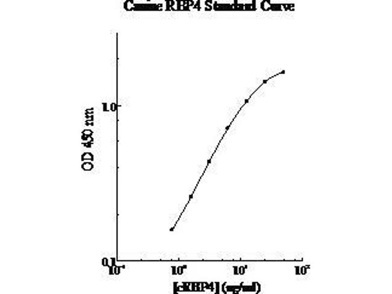 - Canine RBP4 Microplate: A 96-well polystyrene microplate (12 strips of 8 wells) coated with a polyclonal antibody against canine RBP4. Sealing Tapes: Each kit contains 3 precut, pressure sensitive sealing tapes, which can be cut to fit the format of the individual assay. Canine RBP4 Standard: Canine RBP4 in a buffered protein base (50 ng, lyophilized). Biotinylated Canine RBP4 Antibody (50x): A 50-fold concentrated biotinylated polyclonal antibody against canine RBP4 (140 l). MIX Diluent Concentrate (10x): A 10-fold concentrated buffered protein base (30 ml). Wash Buffer Concentrate (20x): A 20-fold concentrated buffered surfactant (30 ml, 2 bottles). Streptavidin-Peroxidase Conjugate (SP Conjugate): A 100-fold concentrate (80 l). Chromogen Substrate: A ready-to-use stabilized peroxidase chromogen substrate tetramethylbenzidine (8 ml). Stop Solution: A 0.5 N hydrochloric acid to stop the chromogen substrate reaction (12 ml).