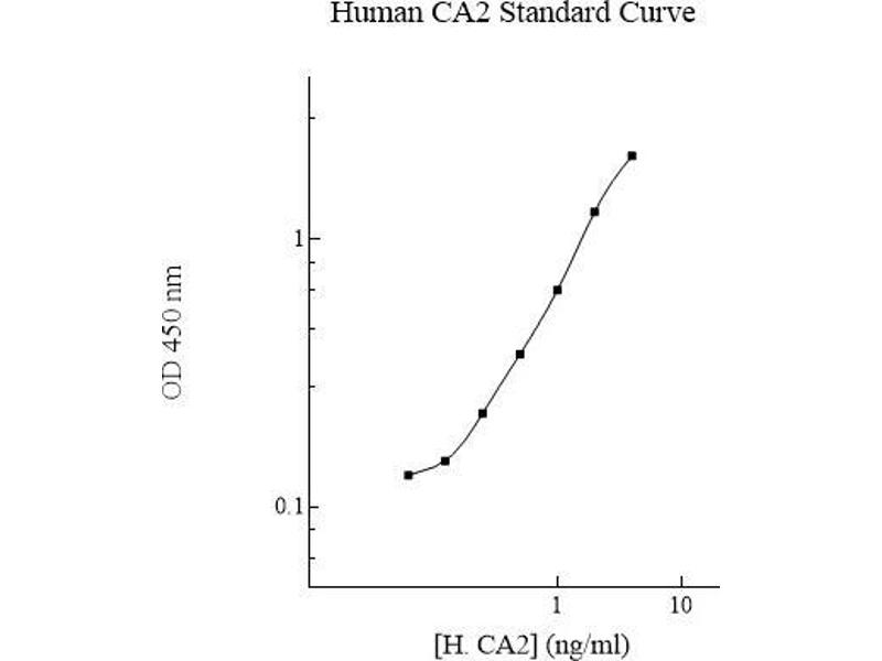 - The AssayMax™ Human Carbonic Anhydrase 2 ELISA (Enzyme-Linked Immunosorbent Assay) Kit is designed for detection of CA2 in human plasma, serum, and cell culture samples. This assay employs a quantitative sandwich enzyme immunoassay technique that measures human CA2 in approximately 4 hours. A polyclonal antibody specific for human CA2 has been pre-coated onto a 96-well microplate with removable strips. CA2 in standards and samples is sandwiched by the immobilized antibody and a biotinylated polyclonal antibody specific for human CA2, which is recognized by a streptavidin-peroxidase (SP) conjugate. All unbound material is washed away and a peroxidase enzyme substrate is added. The color development is stopped and the intensity of the color is measured.