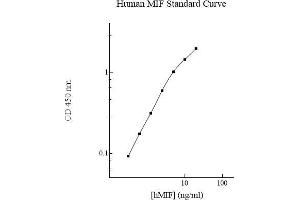 Prepare all reagents, standard solutions, and samples as instructed. Bring all reagents to room temperature before use. The assay is performed at room temperature (20-25 °C). Remove excess microplate strips from the plate frame and return them immediately to the foil pouch with desiccants inside. Reseal the pouch securely to minimize exposure to water vapor and store in a vacuum desiccator. 5 Add 50 l of Human MIF Standard or sample per well. Cover wells with a sealing tape and incubate for 2 hours. Start the timer after the last addition. Wash five times with 200 l of Wash Buffer manually. Invert the plate each time and decant the contents, hit 4-5 times on absorbent material to completely remove the liquid. If using a machine, wash six times with 300 l of Wash Buffer and then invert the plate, decanting the contents, hit 4-5 times on absorbent material to completely remove the liquid. Add 50 l of Biotinylated Human MIF Antibody to each well and incubate for 1 hour. Wash the microplate as described above. Add 50 l of Streptavidin-Peroxidase Conjugate to each well and incubate for 30 minutes. Turn on the microplate reader and set up the program in advance. Wash the microplate as described above. Add 50 l of Chromogen Substrate per well and incubate for 30 minutes or till the optimal blue color density develops. Gently tap plate to ensure thorough mixing and break the bubbles in the well with pipette tip. Add 50 l of Stop Solution to each well. The color will change from blue to yellow. Read the absorbance on a microplate reader at a wavelength of 450 nm immediately. If wavelength correction is available, subtract readings at 570 nm from those at 450 nm to correct optical imperfections. Otherwise, read the plate at 450 nm only. Please note that some unstable black particles may be generated at high concentration points after stopping the reaction for about 10 minutes, which will reduce the readings.