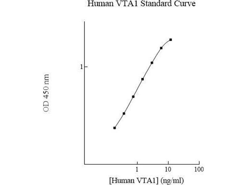 - The AssayMax™ Human VTA1 ELISA (Enzyme-Linked Immunosorbent Assay) kit is designed for detection of human VTA1 in plasma, serum, and cell culture samples. This assay employs a quantitative sandwich enzyme immunoassay technique that measures human VTA1 in less than 4 hours. A polyclonal antibody specific for human VTA1 has been pre-coated onto a 96-well microplate with removable strips. VTA1 in standards and samples is sandwiched by the immobilized antibody and the biotinylated polyclonal antibody specific for VTA1, which is recognized by a streptavidin-peroxidase conjugate. All unbound material is washed away and a peroxidase enzyme substrate is added. The color development is stopped and the intensity of the color is measured.
