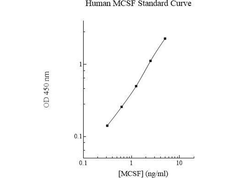 Prepare all reagents, standard solutions, and samples as instructed. Bring all reagents to room temperature before use. The assay is performed at room temperature (20-25 °C). Remove excess microplate strips from the plate frame and return them immediately to the foil pouch with desiccants inside. Reseal the pouch securely to minimize exposure to water vapor and store in a vacuum desiccator. Add 50 l of Human MCSF Standard or sample to each well. Gently tap plate to thoroughly coat the wells. Break any bubbles that may have formed. Cover wells with a sealing tape and incubate for 2 hours. Start the timer after the last addition. Wash five times with 200 l of Wash Buffer manually. Invert the plate each time and decant the contents, hit 4-5 times on absorbent material to completely remove the liquid. If using a machine, wash six times with 300 l of Wash Buffer and then invert the plate, decanting the contents, hit 4-5 times on absorbent material to completely remove the liquid. Add 50 l of Biotinylated Human MCSF Antibody to each well. Gently tap plate to thoroughly coat the wells. Break any bubbles that may have formed. Cover wells with a sealing tape and incubate for 1 hour. Wash the microplate as described above. Add 50 l of Streptavidin-Peroxidase Conjugate to each well. Gently tap plate to thoroughly coat the wells. Break any bubbles that may have 5 formed. Cover wells with a sealing tape and incubate for 30 minutes. Turn on the microplate reader and set up the program in advance. Wash the microplate as described above. Add 50 l of Chromogen Substrate to each well. Gently tap plate to thoroughly coat the wells. Break any bubbles that may have formed. Incubate for 25 minutes or until the optimal blue color density develops. Add 50 l of Stop Solution to each well. The color will change from blue to yellow. Gently tap plate to ensure thorough mixing. Break any bubbles that may have formed. Read the absorbance on a microplate reader at a wavelength of 450 nm immediately. If wavelength correction is available, subtract readings at 570 nm from those at 450 nm to correct optical imperfections. Otherwise, read the plate at 450 nm only. Please note that some unstable black particles may be generated at high concentration points after stopping the reaction for about 10 minutes, which will reduce the readings.