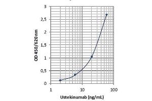 This ELISA is based on Ustekinumab-specific monoclonal antibody (catcher Ab, clone 9C7). Diluted standards and samples are incubated in the microtiter plate coated with IG-9C7 mAb. After incubation, the wells are washed. A biotinylated anti-human IgG monoclonal antibody (clone 1B5, specific for the Fc part of all human IgG i.e. IgG1, IgG2, IgG3 and IgG4) is added and binds to the Fc part of Ustekinumab. Following incubation, wells are washed and the horseradish peroxidase (HRP)-conjugated streptavidin is added and binds to the biotinylated 1B5 mAb. Following incubation, wells are washed and the bound enzymatic activity is detected by addition of chromogen-substrate. The color developed is proportional to the amount of Ustekinumab in the sample or standard. Results of samples can be determined by using the standard curve. Preincubation of Ustekinumab with recombinant human interleukin-12 (IL-12), contains p40 protein subunit as that of IL-23, inhibited the reaction. Therefore, the Ustekinumab ELISA (mAb-based) measures the free form of Ustekinumab.