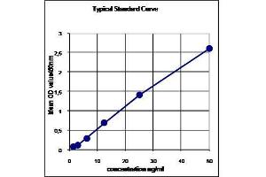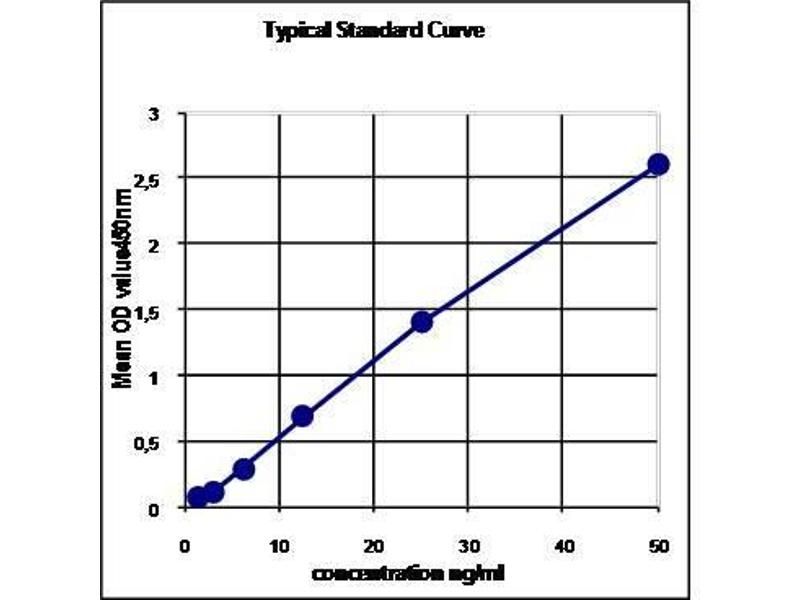 - Samples Pipette 100 μL of standards (50, 25, 12.5, 6.25, 3.12, 1.5 ng/mL= vial a-f), reference serum or diluted samples in duplicate into the corresponding wells of precoated modules (1) and incubate for one hour at room temperature and shaking. 2. 3 x washing with Wash Buffer (A). 3. Detecting antibody Pipette 100 μL detecting antibody (E, vial 2) to each well and incubate at room temperature for 1 hour at shaker. 4. 3 x washing with Wash Buffer (A). 5. Substrate Pipette 100 μL substrate solution (D, vial 9) to each well. Incubate 12-14 min in the dark at room temperature without shaking (depending from temperature in the lab). 6. Stopping Pipette 100 μL stopping solution (vial 8) to each well. Tape plate gently to mix Pipette 100 μL of standards (50, 25, 12.5, 6.25, 3.12, 1.5 ng/mL= vial a-f), reference serum or diluted samples in duplicate into the corresponding wells of precoated modules (1) and incubate for one hour at room temperature and shaking. 2. 3 x washing with Wash Buffer (A). 3. Detecting antibody Pipette 100 μL detecting antibody (E, vial 2) to each well and incubate at room temperature for 1 hour at shaker. 4. 3 x washing with Wash Buffer (A). 5. Substrate Pipette 100 μL substrate solution (D, vial 9) to each well. Incubate 12-14 min in the dark at room temperature without shaking (depending from temperature in the lab). 6. Stopping Pipette 100 μL stopping solution (vial 8) to each well. Tape plate gently to mix