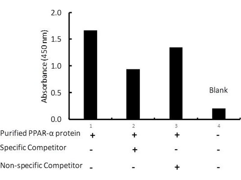 Human PPAR-alpha Transcription Factor Activity Assay. This assay uses a dsDNA coated plate with canonical PPAR-alpha binding sequences to semi-quantitatively detect active PPAR-alpha in lysates or nuclear extracts.