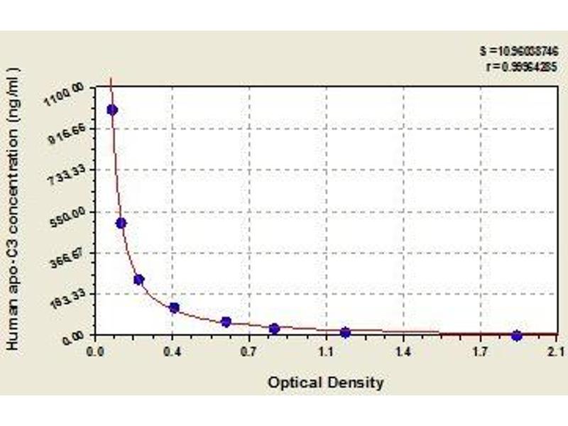- The microtiter plate provided in this kit has been pre-coated with apo-C3. Standards or samples are then added to the appropriate microtiter plate wells with Horseradish Peroxidase (HRP) -conjugated antibody preparation specific for apo-C3, mix well and incubated. The more the amount of apo-C3 in samples, the less HRP-antibody bound by pre-coated apo-C3. Then a TMB (3,3',5,5' tetramethyl-benzidine) substrate solution is added to each well. And the color develops in opposite to the amount of apo-C3 in the sample. The color development is stopped and the intensity of the color is measured.