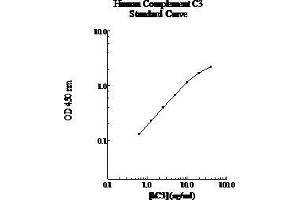 Prepare all reagents, working standards and samples as instructed. Bring all reagents to room temperature before use. The assay is performed at room temperature (20 - 30 °C). Remove excess microplate strips from the plate frame and return them immediately to the foil pouch with desiccant inside. Reseal the pouch securely to minimize exposure to water vapor and store in a vacuum desiccator. Add 50 µL of Complement C3 standard or sample per well. Cover wells with a sealing tape and incubate for two hours. Start the timer after the last sample addition. Wash five times with 200 µL of Wash Buffer manually. Invert the plate each time and decant the contents, hit it 4-5 times on absorbent paper towel to completely remove the liquid. If using a machine wash six times with 300 µL of Wash Buffer and then invert the plate, decant the contents, hit it 4-5 times on absorbent paper towel to completely remove the liquid. Add 50 µL of Biotinylated Complement C3 Antibody to each well and incubate for one hour. Wash a microplate as described above. Add 50 µL of Streptavidin-Peroxidase Conjugate to each well and incubate for 30 minutes. Turn on the microplate reader and set up the program in advance. Wash a microplate as described above. Add 50 µL of Chromogen Substrate per well and incubate for about 10 minutes or till the optimal blue color density develops. Gently tap plate to ensure thorough mixing and break the bubbles in the well with pipette tip. Add 50 µL of Stop Solution to each well. The color will change from blue to yellow. Read the absorbance on a microplate reader at a wavelength of 450 nm immediately. If wavelength correction is available, subtract readings at 570 nm from those at 450 nm to correct optical imperfections. Otherwise, read the plate at 450 nm only. Please note that some unstable black particles may be generated at high concentration points after stopping the reaction for about 10 minutes, which will reduce the readings.