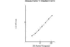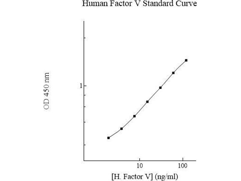 Prepare all reagents, working standards and samples as instructed. Bring all reagents to room temperature before use. The assay is performed at room temperature (20 - 30 °C). Remove excess microplate strips from the plate frame and return them immediately to the foil pouch with desiccant inside. Reseal the pouch securely to minimize exposure to water vapor and store in a vacuum desiccator. Add 50 µL of Standard or sample per well. Cover wells and incubate for two hours. Start the timer after the last sample addition. Wash five times with 200 µL of Wash Buffer manually. Invert the plate each time and decant the contents, hit it 4-5 times on absorbent paper towel to completely remove the liquid. If using a machine wash six times with 300 µL of Wash Buffer and then invert the plate, decant the contents, hit it 4-5 times on absorbent paper towel to completely remove the liquid. Add 50 µL of Biotinylated Factor V Antibody to each well and incubate for one hour. Wash the microplate as described above. Add 50 µL of Streptavidin-Peroxidase Conjugate per well and incubate for 30 minutes. Turn on the microplate reader and set up the program in advance. Wash the microplate as described above. Add 50 µL of Chromogen Substrate per well and incubate for about 20 minutes or till the optimal blue color density develops. Gently tap the plate to ensure thorough mixing and break the bubbles in the well with pipette tip. Add 50 µL of Stop Solution to each well. The color will change from blue to yellow. Read the absorbance on a microplate reader at a wavelength of 450 nm immediately. If wavelength correction is available, subtract readings at 570 nm from those at 450 nm to correct optical imperfections. Otherwise, read the plate at 450 nm only. Please note that some unstable black particles may be generated at high concentration points after stopping the reaction for about 10 minutes, which will reduce the readings.