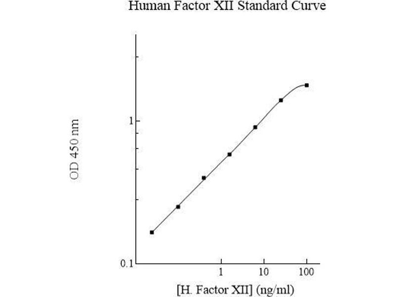 This assay employs a quantitative sandwich enzyme immunoassay technique that measures FxII in less than 4 hours. A murine antibody specific for FxII has been pre-coated onto a 96-well microplate with removable strips. FxII in standards and samples is sandwiched by the immobilized antibody and the biotinylated polyclonal antibody specific for FxII, which is recognized by a streptavidin- peroxidase conjugate. All unbound material is then washed away and a peroxidase enzyme substrate is added. The color development is stopped and the intensity of the color is measured.