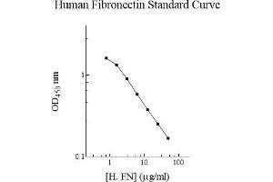 Prepare all reagents, standard solutions, and samples as instructed. Bring all reagents to room temperature before use. The assay is performed at room temperature (20-25 °C). Remove excess microplate strips from the plate frame and return them immediately to the foil pouch with desiccants inside. Reseal the pouch securely to minimize exposure to water vapor and store in a vacuum desiccator. Add 25 l of Human Fibronectin Standard or sample per well and immediately add 25 l of Biotinylated Human Fibronectin Protein to each well (on top of the standard or sample). Gently tap plate to ensure thorough mixing. Break any bubbles that may have formed. Cover wells with a sealing tape and incubate for 2 hours. Start the timer after the last addition. Wash five times with 200 l of Wash Buffer manually. Invert the plate each time and decant the contents, hit 4-5 times on absorbent material to completely remove the liquid. If using a machine, wash six times with 300 l of Wash Buffer and then invert the plate, decanting the contents, hit 4-5 times on absorbent material to completely remove the liquid. 5 Add 50 l of Streptavidin-Peroxidase Conjugate to each well. Gently tap plate to thoroughly coat the wells. Break any bubbles that may have formed. Cover wells with a sealing tape and incubate for 30 minutes. Turn on the microplate reader and set up the program in advance. Wash the microplate as described above. Add 50 l of Chromogen Substrate to each well. Gently tap plate to thoroughly coat the wells. Break any bubbles that may have formed. Incubate for 25 minutes or till the optimal blue color density develops. Add 50 l of Stop Solution to each well. The color will change from blue to yellow. Gently tap plate to ensure thorough mixing. Break any bubbles that may have formed. Read the absorbance on a microplate reader at a wavelength of 450 nm immediately. If wavelength correction is available, subtract readings at 570 nm from those at 450 nm to correct optical imperfections. Otherwise, read the plate at 450 nm only. Please note that some unstable black particles may be generated at low concentration points after stopping the reaction for about 10 minutes, which will reduce the readings.