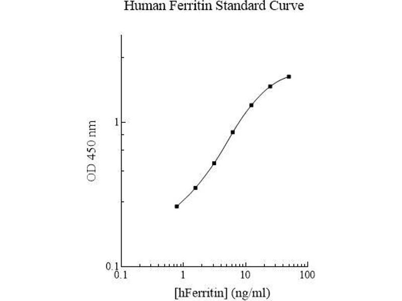 Prepare all reagents, working standards and samples as instructed. Bring all reagents to room temperature before use. The assay is performed at room temperature (20 - 30 °C). Remove excess microplate strips from the plate frame and return them immediately to the foil pouch with desiccant inside. Reseal the pouch securely to minimize exposure to water vapor and store in a vacuum desiccator. Add 50 µL of Standard or sample per well. Cover wells with a sealing tape and incubate for two hours. Start the timer after the last sample addition. Wash five times with 200 µL of Wash Buffer manually. Invert the plate each time and decant the contents, hit it 4-5 times on absorbent paper towel to completely remove the liquid. If using a machine wash six times with 300 µL of Wash Buffer and then invert the plate, decant the contents, hit it 4-5 times on absorbent paper towel to completely remove the liquid. Add 50 µL of Biotinylated Ferritin Antibody to each well and incubate for one hour. Wash a microplate as described above. Add 50 µL of Streptavidin-Peroxidase Conjugate per well and incubate for 30 minutes. Turn on the microplate reader and set up the program in advance. Wash a microplate as described above. Add 50 µL of Chromogen Substrate per well and incubate for about 10 minutes or till the optimal color density develops. Gently tap the plate to ensure thorough mixing and break the bubbles in the well with pipette tip. Add 50 µL of Stop Solution to each well. The color will change from blue to yellow. Read the absorbance on a microplate reader at a wavelength of 450 nm immediately. If wavelength correction is available, subtract readings at 570 nm from those at 450 nm to correct optical imperfections. Otherwise, read the plate at 450 nm only. Please note that some unstable black particles may be generated at high concentration points after stopping the reaction for about 10 minutes, which will reduce the readings.