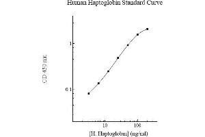 Prepare all reagents, standard solutions, and samples as instructed. Bring all reagents to room temperature before use. The assay is performed at room temperature (20-25 °C). Remove excess microplate strips from the plate frame and return them immediately to the foil pouch with desiccants inside. Reseal the pouch securely to minimize exposure to water vapor and store in a vacuum desiccator. Add 50 l of Human Haptoglobin Standard or sample to each well. Gently tap plate to thoroughly coat the wells. Break any bubbles that may have formed. Cover wells with a sealing tape and incubate for 2 hours. Start the timer after the last addition. Wash five times with 200 l of Wash Buffer manually. Invert the plate each time and decant the contents, hit 4-5 times on absorbent material to completely remove the liquid. If using a machine, wash six times with 300 l of Wash Buffer and then invert the plate, decanting the contents, hit 4-5 times on absorbent material to completely remove the liquid. Add 50 l of Biotinylated Human Haptoglobin Antibody to each well. Gently tap plate to thoroughly coat the wells. Break any bubbles that may have formed. Cover wells with a sealing tape and incubate for 1 hour. Wash the microplate as described above. Add 50 l of Streptavidin-Peroxidase Conjugate to each well. Gently tap plate to thoroughly coat the wells. Break any bubbles that may have formed. Cover wells with a sealing tape and incubate for 30 minutes. Turn on the microplate reader and set up the program in advance. Wash the microplate as described above. Add 50 l of Chromogen Substrate to each well. Gently tap plate to thoroughly coat the wells. Break any bubbles that may have formed. Incubate for 10 minutes or until the optimal blue color density develops. Add 50 l of Stop Solution to each well. The color will change from blue to yellow. Gently tap plate to ensure thorough mixing. Break any bubbles that may have formed. Read the absorbance on a microplate reader at a wavelength of 450 nm immediately. If wavelength correction is available, subtract readings at 570 nm from those at 450 nm to correct optical imperfections. Otherwise, read the plate at 450 nm only. Please note that some unstable black particles may be generated at high concentration points after stopping the reaction for about 10 minutes, which will reduce the readings. 6