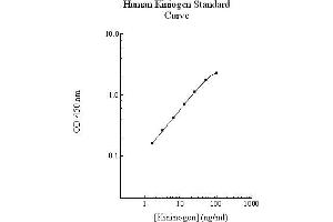 Prepare all reagents, working standards and samples as instructed. Bring all reagents to room temperature before use. The assay is performed at room temperature (20 - 30 °C). Remove excess microplate strips from the plate frame and return them immediately to the foil pouch with desiccant inside. Reseal the pouch securely to minimize exposure to water vapor and store in a vacuum desiccator. Add 50 µL of Kininogen standard or sample per well. Cover wells with a sealing tape and incubate for two hours. Start the timer after the last sample addition. Wash five times with 200 µL of Wash Buffer. Invert the plate and decant the contents, and hit it 4-5 times on absorbent paper towel to completely remove liquid at each step. Add 50 µL of Biotinylated Kininogen Antibody to each well and incubate for one hour. Wash five times with 200 µL of Wash Buffer. Invert the plate and decant the contents, and hit it 4-5 times on absorbent paper towel to complete remove liquid at each step. Add 50 µL of Streptavidin-Peroxidase Conjugate to each well and incubate for 30 minutes. Turn on the microplate reader and set up the program in advance. Wash five times with 200 µL of Wash Buffer. Add 50 µL of Chromogen Substrate per well and incubate for about 10 minutes or till the optimal blue color density develops. Gently tap plate to ensure thorough mixing and break the bubbles in the well with pipette tip. Add 50 µL of Stop Solution to each well. The color will change from blue to yellow. Read the absorbance on a microplate reader at a wavelength of 450 nm immediately. Please note that after the reaction is stopped for about 10 minutes, some black particles may be generated at high concentration point, which will reduce the readings.