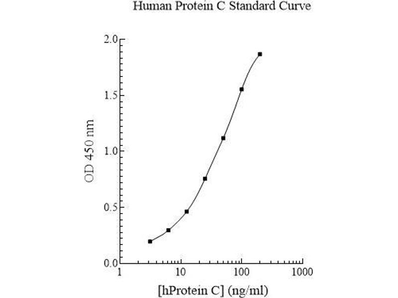 Prepare all reagents, working standards and samples as instructed. Bring all reagents to room temperature before use. The assay is performed at room temperature (20 - 30 °C). Remove excess microplate strips from the plate frame and return them immediately to the foil pouch with desiccant inside. Reseal the pouch securely to minimize exposure to water vapor and store in a vacuum desiccator. Add 50 µL of Protein C standard or sample per well. Cover wells with a sealing tape and incubate for two hours. Start the timer after the last sample addition. Wash five times with 200 µL of Wash Buffer manually. Invert the plate each time and decant the contents, hit it 4-5 times on absorbent paper towel to completely remove the liquid. If using a machine wash six times with 300 µL of Wash Buffer and then invert the plate, decant the contents, hit it 4-5 times on absorbent paper towel to completely remove the liquid. Add 50 µL of Biotinylated Protein C Antibody to each well and incubate for one hour. Wash the microplate as described above. Add 50 µL of Streptavidin-Peroxidase Conjugate to each well and incubate for 30 minutes. Turn on the microplate reader and set up the program in advance. Wash the microplate as described above. 3 Add 50 µL of Chromogen Substrate per well and incubate for about 12 minutes or till the optimal blue color density develops. Gently tap plate to ensure thorough mixing and break the bubbles in the well with pipette tip. Add 50 µL of Stop Solution to each well. The color will change from blue to yellow. Read the absorbance on a microplate reader at a wavelength of 450 nm immediately. If wavelength correction is available, subtract readings at 570 nm from those at 450 nm to correct optical imperfections. Otherwise, read the plate at 450 nm only. Please note that some unstable black particles may be generated at high concentration points after stopping the reaction for about 10 minutes, which will reduce the readings.