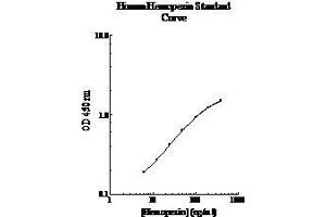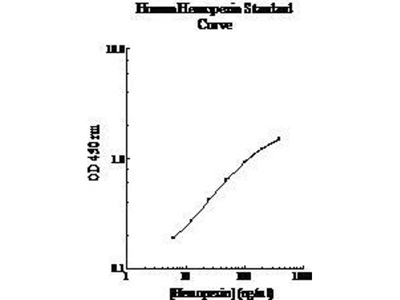 Prepare all reagents, working standards and samples as instructed. Bring all reagents to room temperature before use. The assay is performed at room temperature (20 - 30 °C). Remove excess microplate strips from the plate frame and return them immediately to the foil pouch with desiccant inside. Reseal the pouch securely to minimize exposure to water vapor and store in a vacuum desiccator. Add 50 µL of Standard or sample per well. Cover wells with a sealing tape and incubate for two hours. Start the timer after the last sample addition. Wash five times with 200 µL of Wash Buffer. Invert the plate and decant the contents, and hit it 4-5 times on absorbent paper towel to complete remove liquid at each step. Add 50 µL of Biotinylated Hemopexin Antibody to each well and incubate for one hour. Wash five times with 200 µL of Wash Buffer. Add 50 µL of Streptavidin-Peroxidase Conjugate per well and incubate for 30 minutes. Turn on the microplate reader and set up the program in advance. Wash five times with 200 µL of Wash Buffer. Add 50 µL of Chromogen Substrate per well and incubate for about 10 minutes or till the optimal blue color density develops. Gently tap plate to ensure thorough mixing and break the bubbles in the well with pipette tip. Add 50 µL of Stop Solution to each well. The color will change from blue to yellow. Read the absorbance on a microplate reader at a wavelength of 450 nm immediately. Please note that some unstable black particles may be generated at high concentration points after stopping the reaction for about 10 minutes, which will reduce the readings.