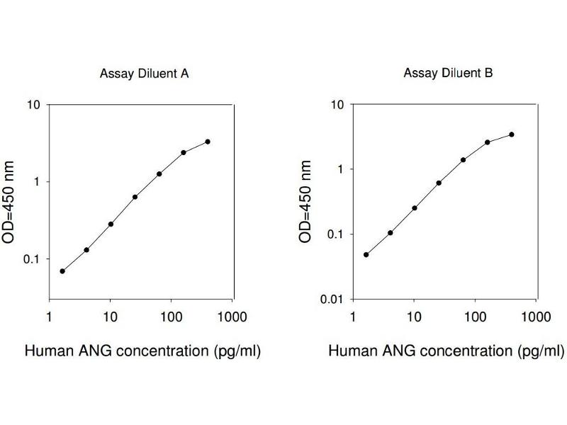 Typical Data: These standard curves are for demonstration only. A standard curve must be run with each assay. Human ANG concentration (pg/mL) 1 10 100 1000 O D =4 50 n m 0.1 1 10 Assay Diluent A Human ANG concentration (pg/mL) 1 10 100 1000 O D =4 50 n m 0.01 0.1 1 10 Assay Diluent B