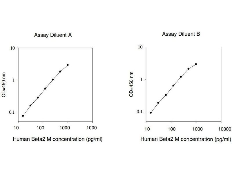 Typical Data: These standard curves are for demonstration only. A standard curve must be run with each assay. Assay Diluent A Human Beta2 M concentration (pg/mL) O D =4 50 n m 0.1 1 10 10 100 1000 1000 Assay Diluent B Human Beta2 M concentration (pg/mL) O D =4 50 n m 0.1 1 10 10 100 1000 10000