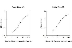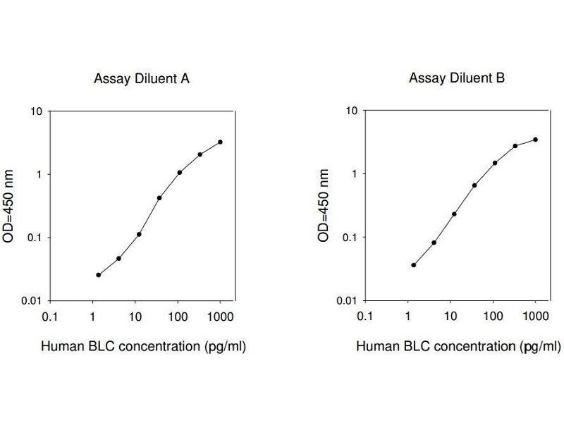 Typical Data: These standard curves are for demonstration only. A standard curve must be run with each assay. Assay Diluent A Human BLC concentration (pg/mL) 0.1 1 10 100 1000 O D =4 50 n m 0.01 0.1 1 10 Assay Diluent B Human BLC concentration (pg/mL) 0.1 1 10 100 1000 O D =4 50 n m 0.01 0.1 1 10