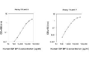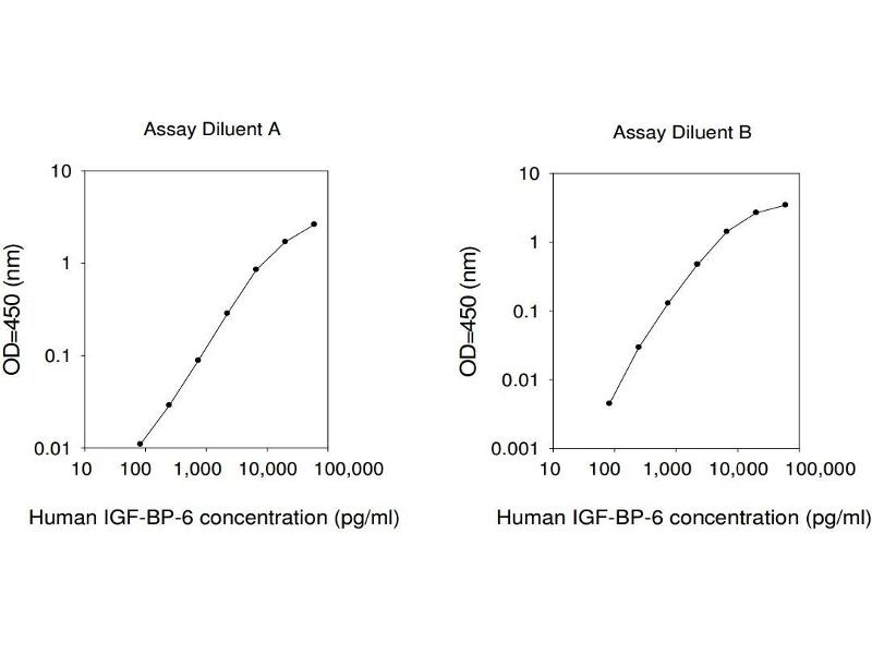 - IGF-BPs (Insulin-like growth factor binding proteins) are found in various body fluids such as blood serum, amniotic fluid, and liquor. They are synthesized in the liver and are produced also by various tumor cell lines and cell types. Human IGFBP6 is an O-glycosylated protein. It is abundant in cerebrospinal fluid and has a marked preferential binding affinity for IGF-2 over IGF-1. Levels of IGFBP6 have been found to be increased in human breast cancer cells treated with estradiol and IGF-1 and may thus contribute to mitogenesis. The Human IGF-BP-6 ELISA (Enzyme-Linked Immunosorbent Assay) kit is an in vitro enzyme-linked immunosorbent assay for the quantitative measurement of human IGF-BP-6 in serum, plasma, cell culture supernatants and urine. This assay employs an antibody specific for human IGF-BP-6 coated on a 96-well plate. Standards and samples are pipetted into the wells and IGF-BP-6 present in a sample is bound to the wells by the immobilized antibody. The wells are washed and biotinylated anti-human IGF-BP-6 antibody is added. After washing away unbound biotinylated antibody, HRP-conjugated streptavidin is pipetted to the wells. The wells are again washed, a TMB substrate solution is added to the wells and color develops in proportion to the amount of IGF-BP-6 bound. The Stop Solution changes the color from blue to yellow, and the intensity of the color is measured at 450 nm. Reproducibility: Intra-Assay: CV<10% Inter-Assay: CV<12%.