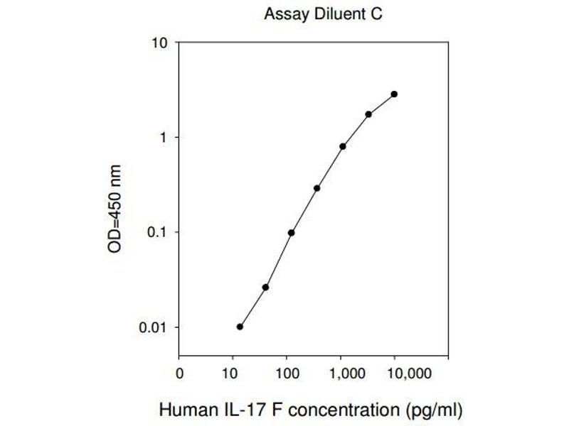 - Bring all reagents and samples to room temperature (18 - 25°C) before use. 2. Sample dilution: If your samples need to be diluted, Assay Diluent C (Item L) is used for dilution of serum/plasma/culture supernatants/urine. 3. Assay Diluent B (Item E) should be diluted 5-fold with deionized or distilled water before use. 4. Preparation of standard: Briefly spin the vial of Item C. Add 400 µl Assay Diluent C (Item L) into Item C vial to prepare a 50 ng/ml standard solution. Dissolve the powder thoroughly by a gentle mix. Add 100 µl IL-17F standard from the vial of Item C, into a tube with 400 µl Assay Diluent C to prepare a 10,000 pg/ml standard solution. Pipette 400 µl Assay Diluent C into each tube. Use the stock standard solution to produce a dilution series (shown below). Mix each tube thoroughly before the next transfer. Gently vortex to mix. Assay Diluent C serves as the zero standard (0 pg/ml). 5. If the Wash Concentrate (20x) (Item B) contains visible crystals, warm to room temperature and mix gently until dissolved. Dilute 20 ml of Wash Buffer Concentrate into deionized or distilled water to yield 400 ml of 1x Wash Buffer. 6. Briefly spin the Detection Antibody vial (Item F) before use. Add 100 µl of 1x Assay Diluent B (Item E) into the vial to prepare a detection antibody concentrate. Pipette up and down to mix gently (the concentrate can be stored at 4°C for 5 days). The detection antibody concentrate should be diluted 80-fold with 1x Assay Diluent B and used in step 4 of Part VI Assay Procedure. 7. Briefly spin the HRP-Streptavidin concentrate vial (Item G) and pipette up and down to mix gently before use. HRP-Streptavidin concentrate should be diluted 10,000-fold with 1x Assay Diluent B (Item E). For example: Briefly spin the vial (Item G) and pipette up and down to mix gently . Add 2 µl of HRP-Streptavidin concentrate into a tube with 198.0 µl 1x Assay Diluent B to prepare a 100-fold diluted HRP-Streptavidin solution (do not store the diluted solution for next day use). Mix through and then pipette 100 µl of prepared 100-fold diluted solution into a tube with 10 ml 1x Assay Diluent B to prepare a final 10,000 fold diluted HRP-Streptavidin solution.