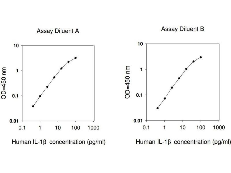 Typical Data: These standard curves are for demonstration only. A standard curve must be run with each assay. Assay Diluent A Human IL-1beta concentration (pg/mL) 0.1 1 10 100 1000 O D =4 50 n m 0.01 0.1 1 10 Assay Diluent B Human IL-1beta concentration (pg/mL) 0.1 1 10 100 1000 O D =4 50 n m 0.01 0.1 1 10