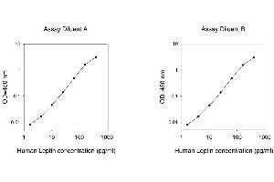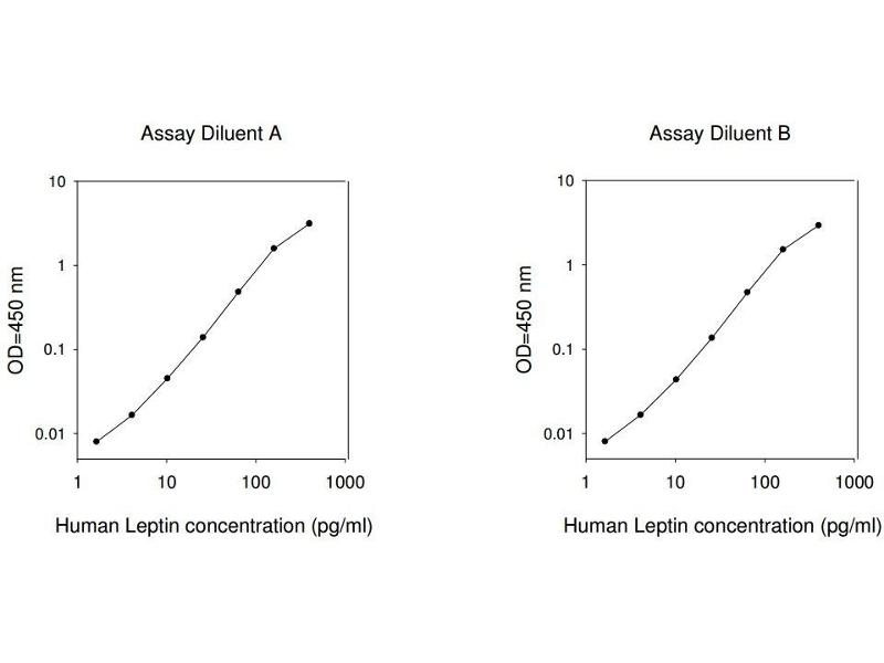 Typical Data: These standard curves are for demonstration only. A standard curve must be run with each assay. Assay Diluent A Human Leptin concentration (pg/mL) 1 10 100 1000 O D =4 50 n m 0.01 0.1 1 10 Assay Diluent B Human Leptin concentration (pg/mL) 1 10 100 1000 O D =4 50 n m 0.01 0.1 1 10