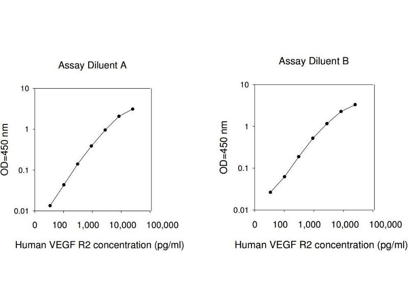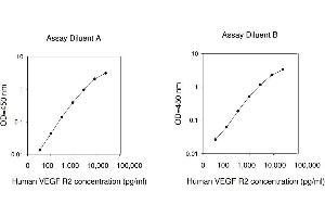 Typical Data: These standard curves are for demonstration only. A standard curve must be run with each assay. Assay Diluent A Human VEGF R2 concentration (pg/mL) O D =4 50 n m 0.01 0.1 1 10 0 100 1,000 10,000 100,000 Assay Diluent B Human VEGF R2 concentration (pg/mL) O D =4 50 n m 0.01 0.1 1 10 0 100 1,000 10,000 100,000