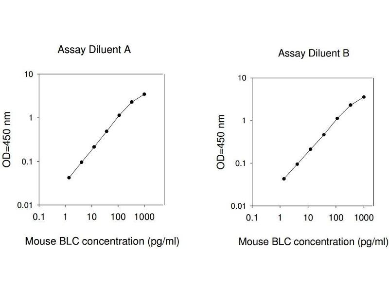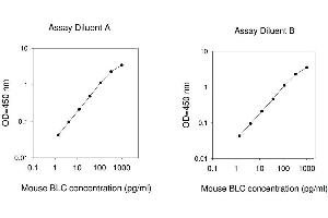 Typical Data: These standard curves are for demonstration only. A standard curve must be run with each assay. Assay Diluent A Mouse BLC concentration (pg/mL) 0.1 1 10 100 1000 O D =4 50 n m 0.01 0.1 1 10 Assay Diluent B Mouse BLC concentration (pg/mL) 0.1 1 10 100 1000 O D =4 50 n m 0.01 0.1 1 10