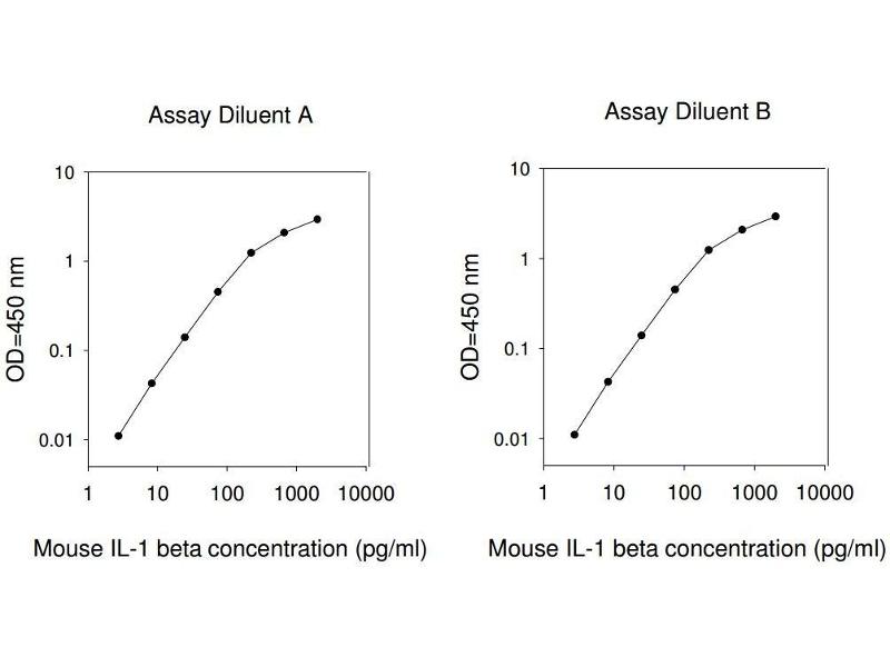 Typical Data: These standard curves are for demonstration only. A standard curve must be run with each assay. Assay Diluent A Mouse IL-1 beta concentration (pg/mL) 1 10 100 1000 10000 O D =4 50 n m 0.01 0.1 1 10 Assay Diluent B Mouse IL-1 beta concentration (pg/mL) 1 10 100 1000 10000 O D =4 50 n m 0.01 0.1 1 10