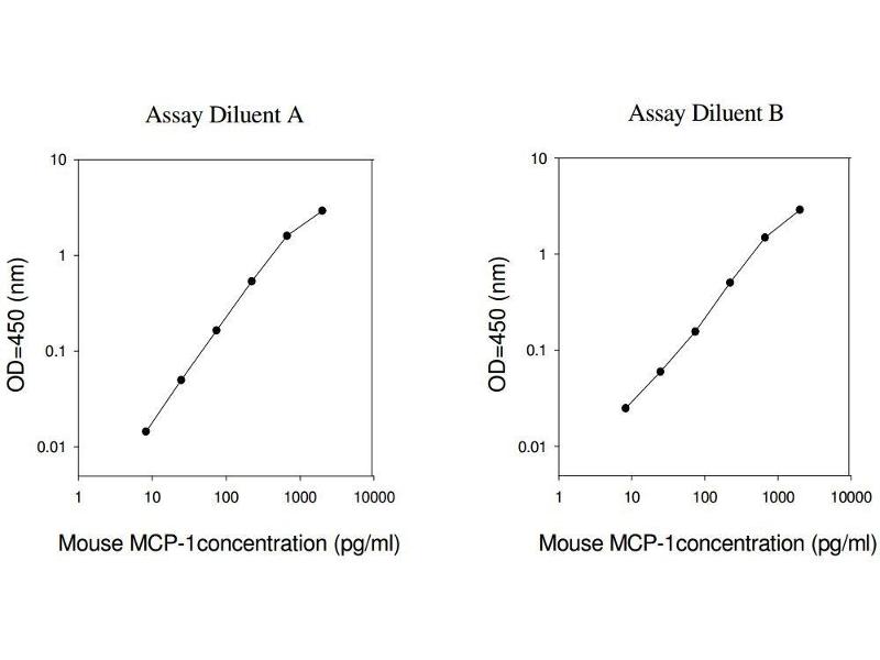 Typical Data: These standard curves are for demonstration only. A standard curve must be run with each assay. Assay Diluent A Mouse MCP-1concentration (pg/mL) 1 10 100 1000 10000 O D =4 50 (n m ) 0.01 0.1 1 10 Assay Diluent B Mouse MCP-1concentration (pg/mL) 1 10 100 1000 10000 O D =4 50 (n m ) 0.01 0.1 1 10