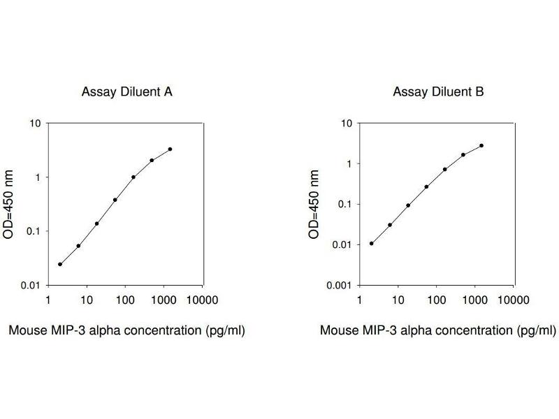 Typical Data: These standard curves are for demonstration only. A standard curve must be run with each assay. Assay Diluent A Mouse MIP-3 alpha concentration (pg/mL) 1 10 100 1000 10000 O D =4 50 n m 0.01 0.1 1 10 Assay Diluent B Mouse MIP-3 alpha concentration (pg/mL) 1 10 100 1000 10000 O D =4 50 n m 0.001 0.01 0.1 1 10